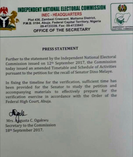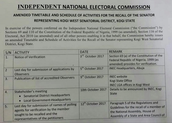 The Independent National Electoral Commission (INEC) today released an amended timetable and schedule of activities for the recall of Senator Dino Melaye, who represents the Kogi West Senatorial District.